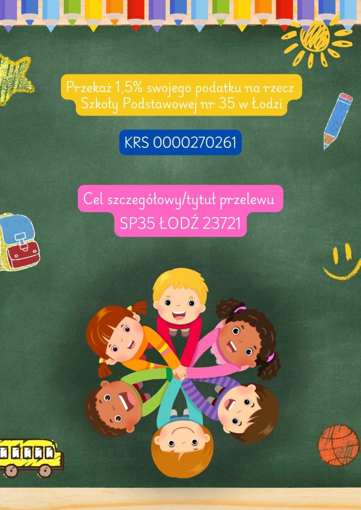 Dyrektor Szkoły Podstawowej nr 35 im. M. Piechala w Łodzi w imieniu całej społeczności szkolnej zwraca się z ogromna prośbą o przekazanie 1,5 % należnego podatku za rok 2024 na Szkołę Podstawową nr 35 im. Mariana Piechala w Łodzi KRS:0000270261 Cel szczegółowy/tytuł przelewu SP35 ŁODŹ 23721 Dlaczego warto? Przekazanie 1,5% swojego podatku to doskonała okazja, by wspierać naszą […]