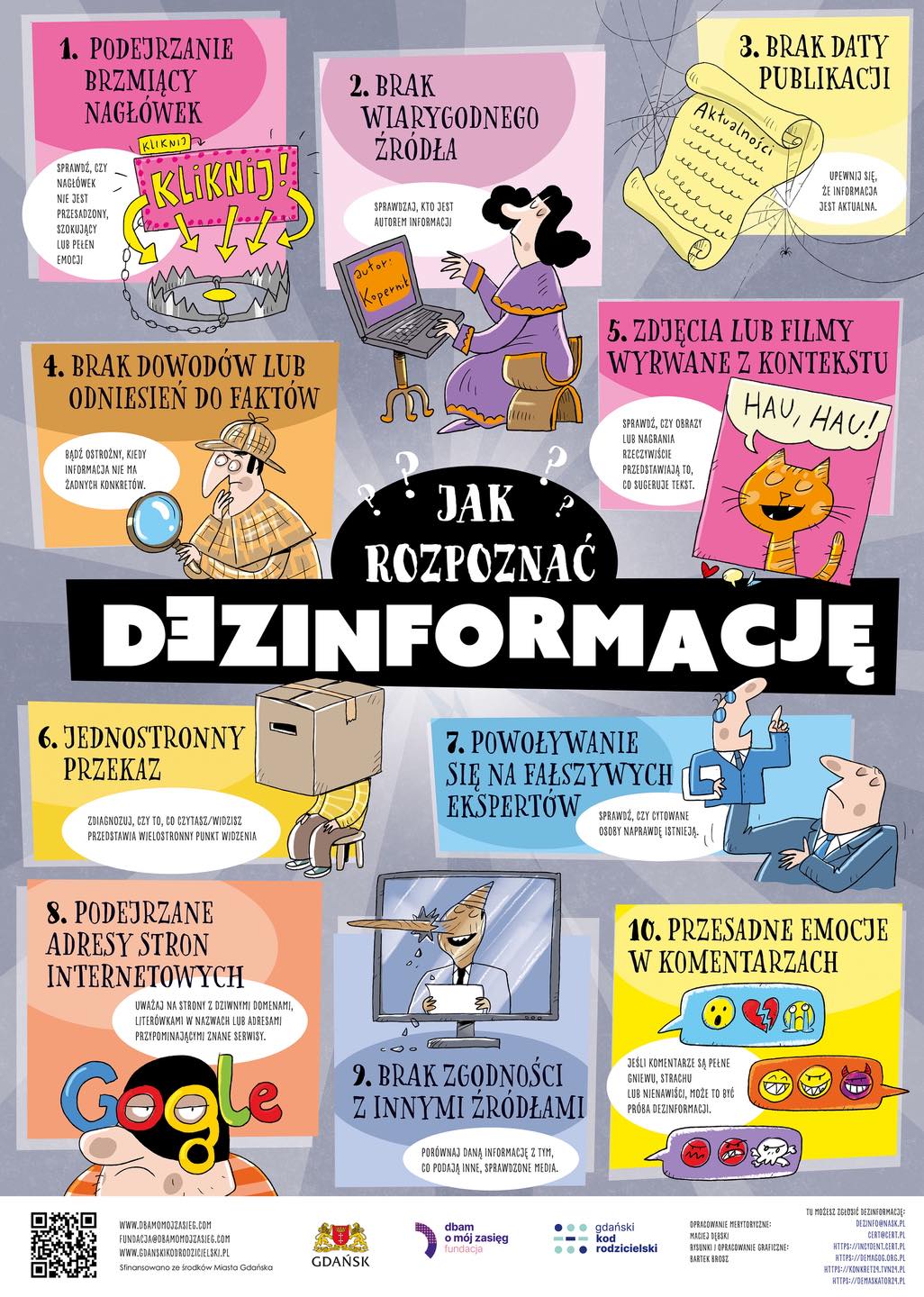 Prezentujemy plakat edukacyjny „Jak rozpoznać dezinformację”, który w przystępny i humorystyczny sposób pokazuje, na co warto zwracać uwagę, przeglądając internet.