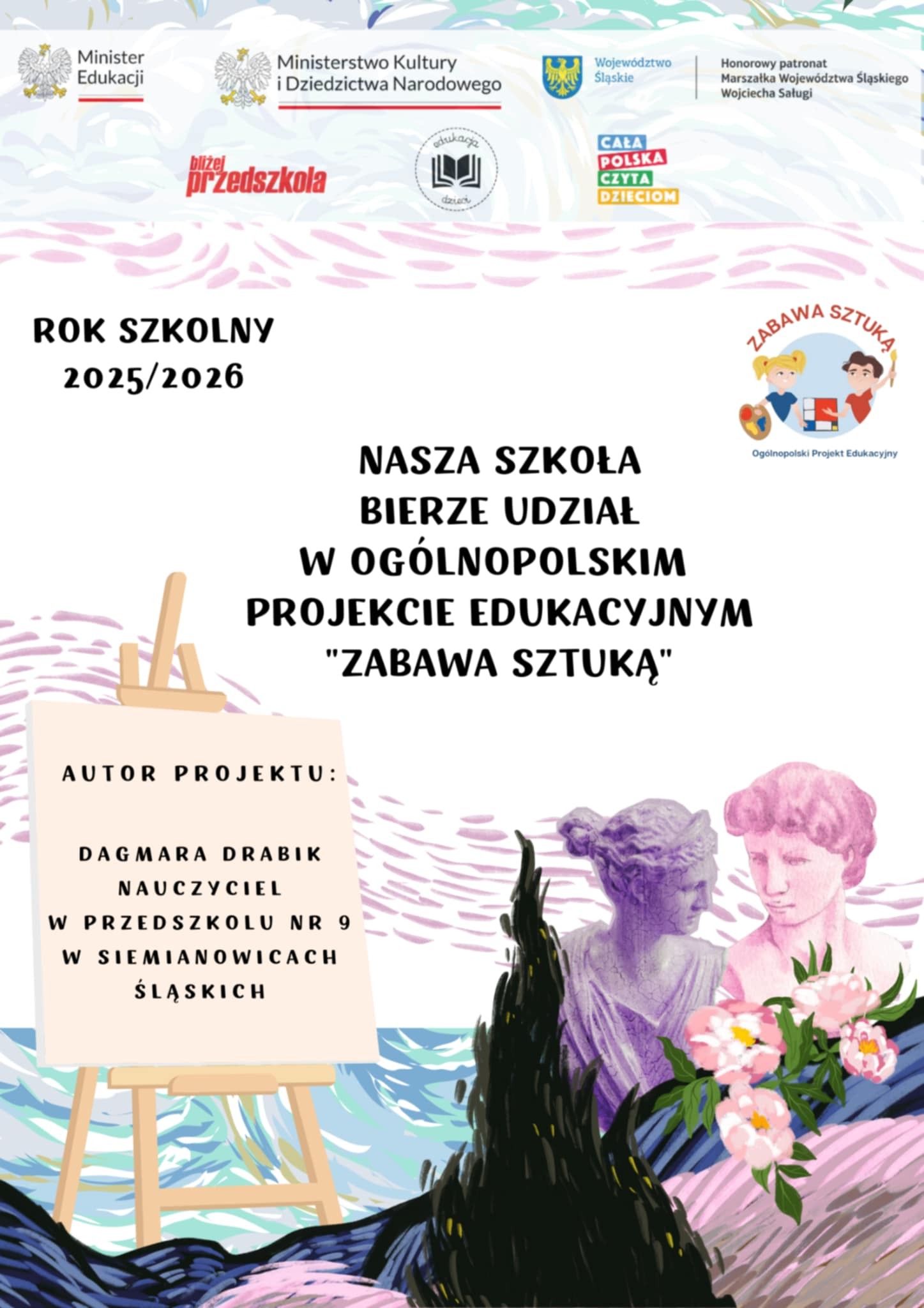 Z radością informujemy, że nasza szkoła bierze udział w ogólnopolskim projekcie edukacyjnym „Zabawa sztuką”, którego celem jest rozwijanie wrażliwości artystycznej dzieci i młodzieży, kreatywnego myślenia oraz zainteresowania sztuką poprzez zabawę, eksperymenty i twórcze działanie.